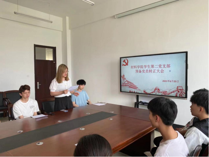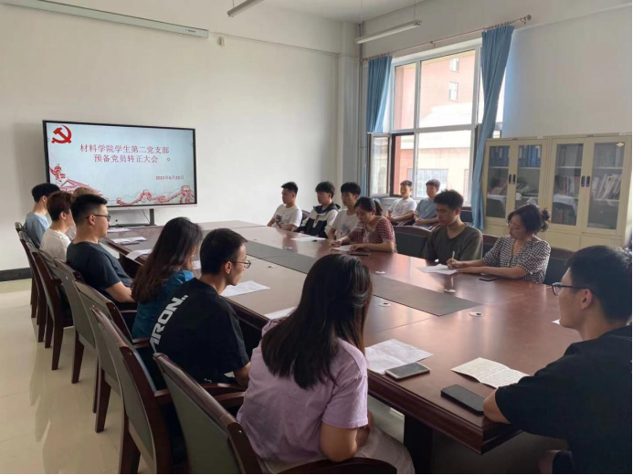 学生第一党支部于材料楼425会议室召开转正大会。本次大会由党支部书记张晓君主持,对王鑫等9名同志是否能如期转正进行讨论和表决。