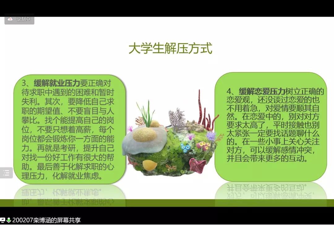 200207班学习委员栾博涵首先讲述关于心理健康知识,以及在大学期间遇到的心理压力并提出缓解压力的方法。