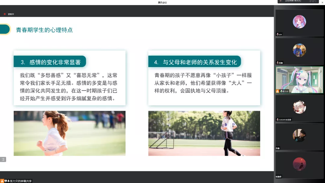 从进入大学到现在,随着学习等各方面压力的不断增大,有些同学的心理有了一定的变化,而摆正心态,迎接新的挑战,已经成了我们当下不可忽视的问题。带班学生张力文从心理特点入手,描述了青春期容易造成的几个心理问题;而后着重强调了解决这些问题应该如何下手,让同学们了解心理的新概念,认识到关爱的力量,协助的力量,同时,为了让大家了解心理健康的重要性,用霍金的例子,让大家切实感受如何做到心理健康。