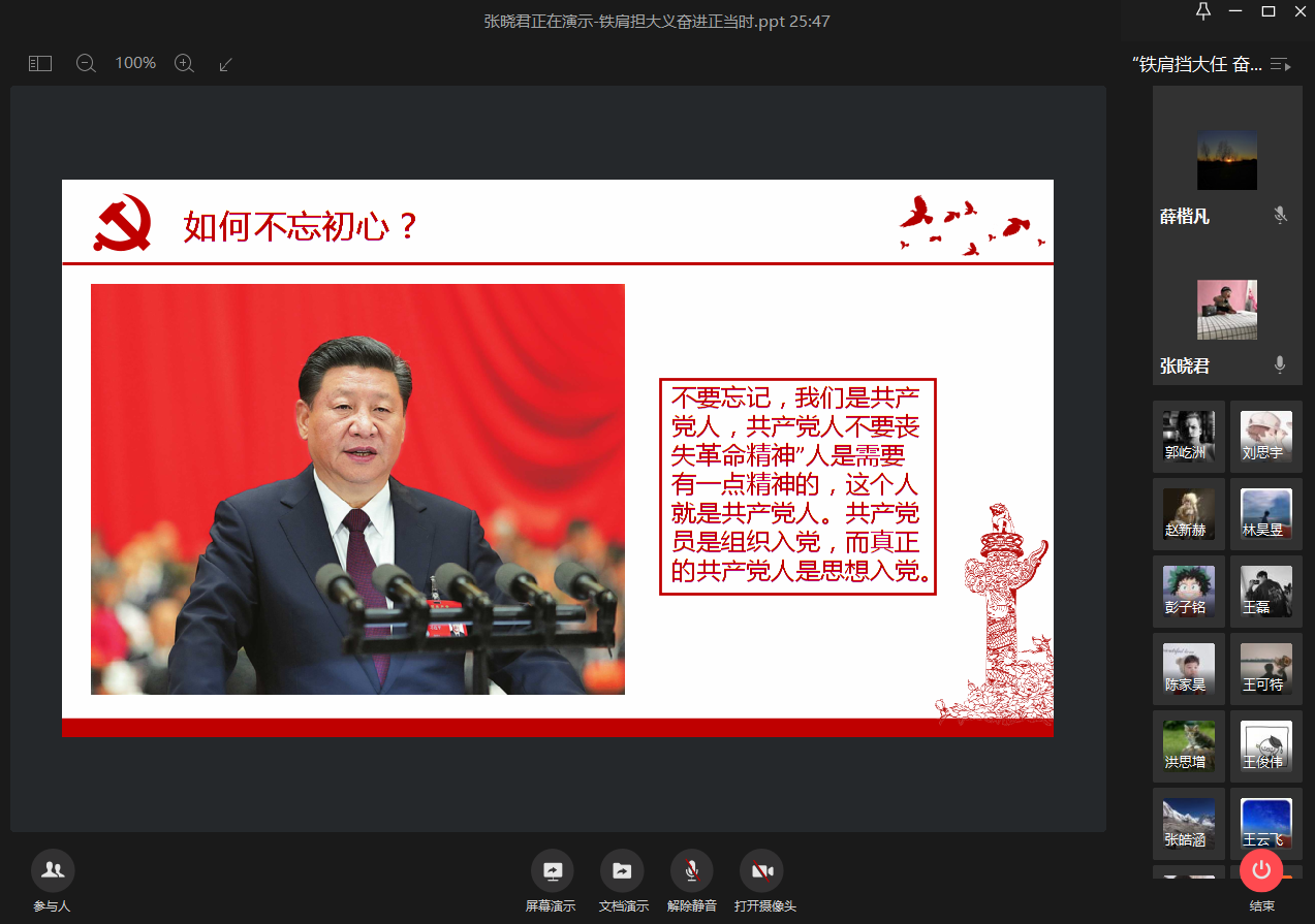张晓君老师联系抗击新冠疫情一线的共产党员,进一步说明党共产党人的革命精神。要求同学们成为一名合格的共产党员就要需要在思想上真正入党,牢记党的宗旨,将正确的动机融入到为人民服务的实践中去,树立爱党爱国的观念,发扬坚持与奉献的精神。