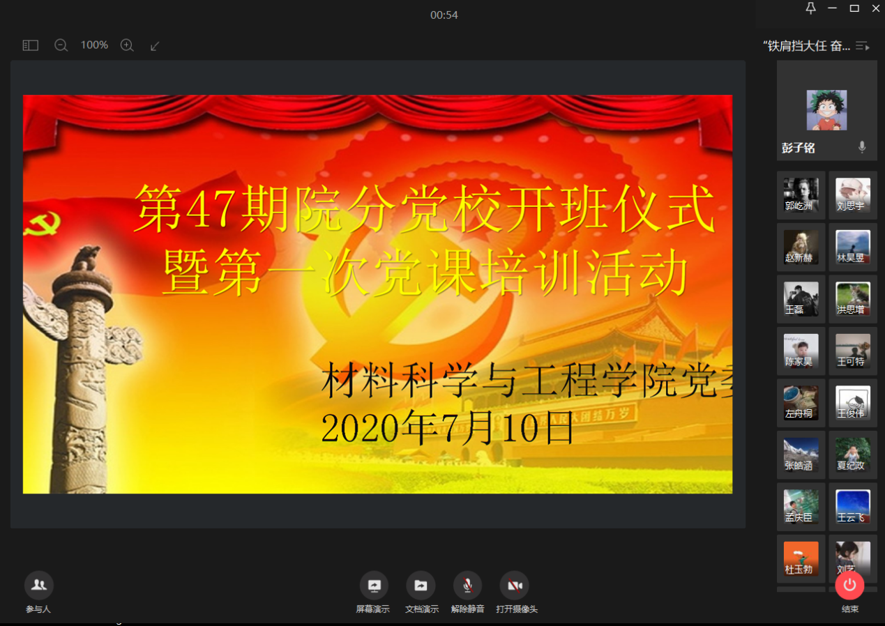 第47期党课学员通过线上形式进行党课培训。2020年7月10日开展开班仪式,学生第二党支部书记张晓君老师线上以企业微信为媒介对全体同学讲授党课。党委书记兰民通过腾讯课堂给全体同学讲述党课。