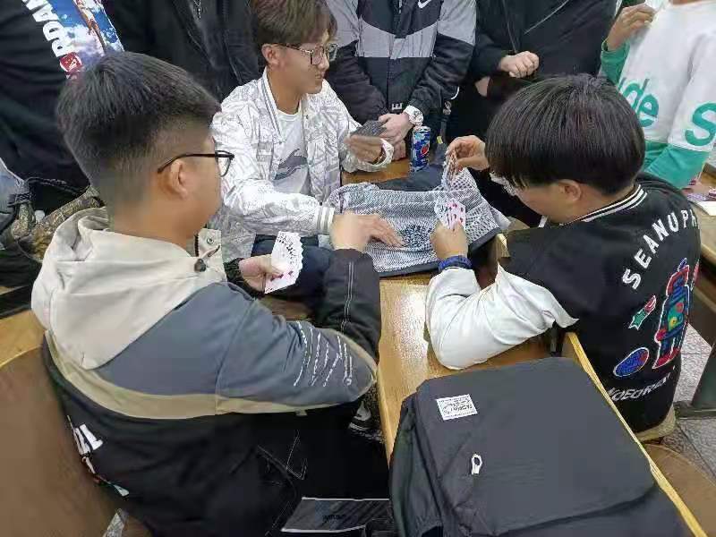 首先由体育部学长宣读比赛细则,并让选手抽签分组。比赛采用回合积分制斗地主7个班共21人参赛,刨幺共12人参赛。同学们斗志昂扬,磨拳擦掌。第一轮比赛结束,五子棋共6人晋级,跳棋共6人晋级,斗地主共6人晋级,刨幺共4个班级,象棋3人。