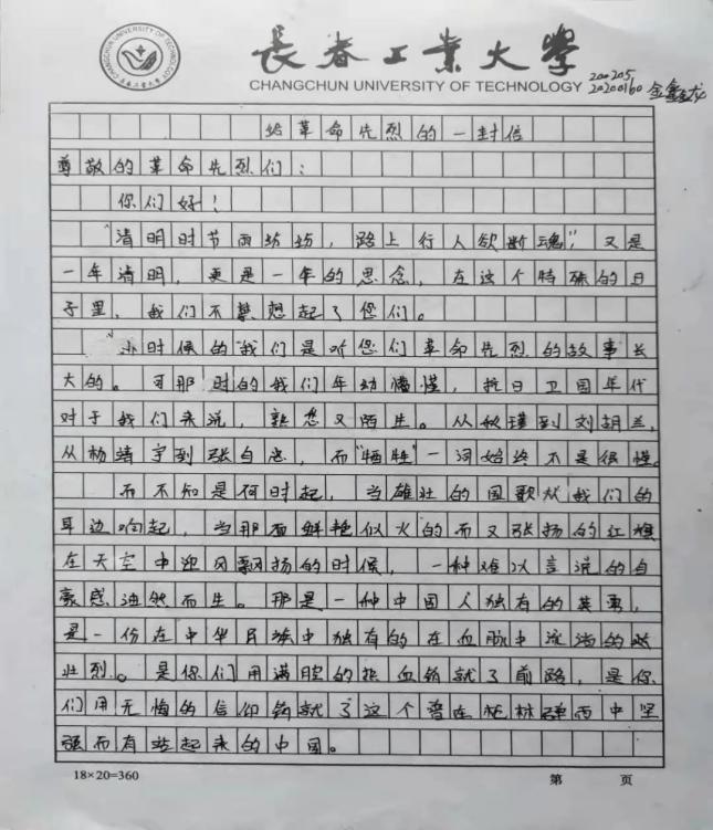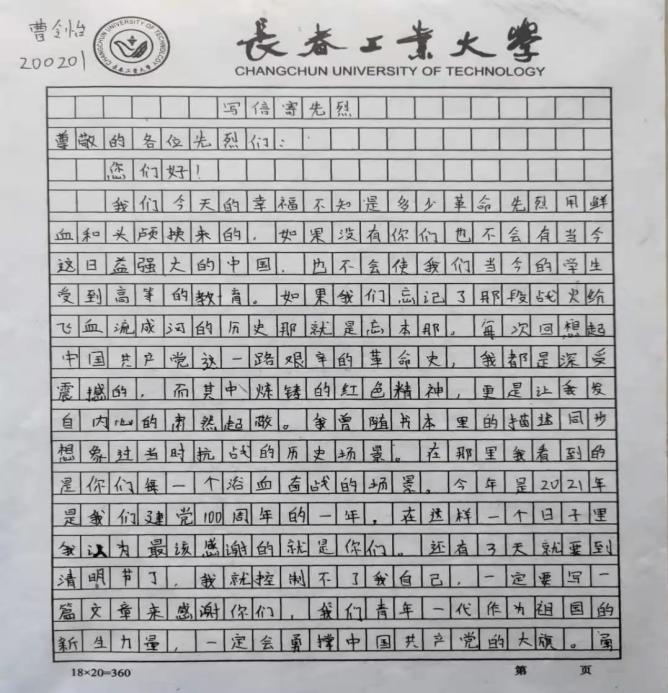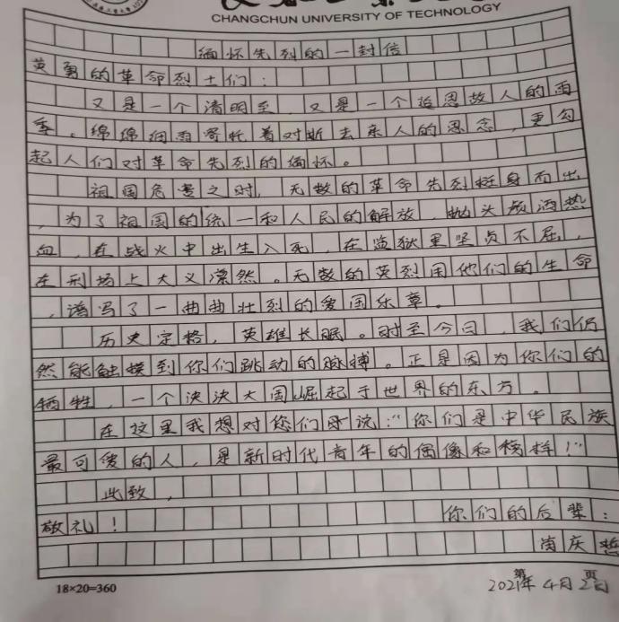 材院网讯(通讯员 丁源浩)为祝贺中国共产党成立一百周年,缅怀为国家奉献生命的先烈们,加强学生红色意识和红色精神。按学校相关要求,porn91 于4月4日开展“写信寄先烈”清明线上缅怀纪念活动。
