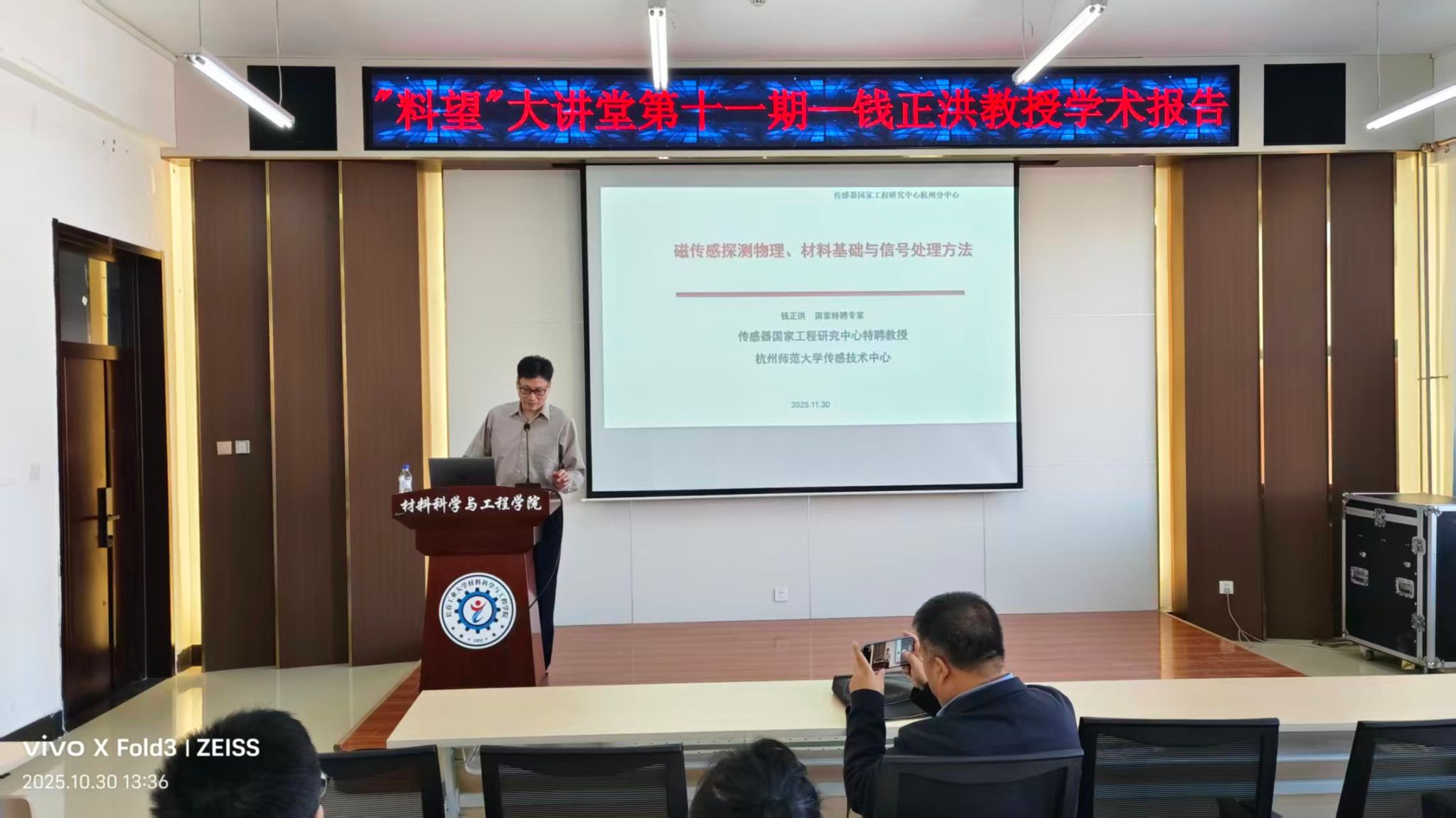 “料望”大讲堂系列学术报告第十一期在材料楼417会议室举行。特邀杭州师范大学传感中心主任、四川大学博士生导师、浙江省“ 钱江学者”、 浙江省特聘专家、浙江省“智能识别关键技术及应用”重点科技创新团队首席科学家钱正洪教授作学术报告。报告会由李于朋副院长主持,学院领导、部分青年教师、博士/硕士研究生参加了报告会。